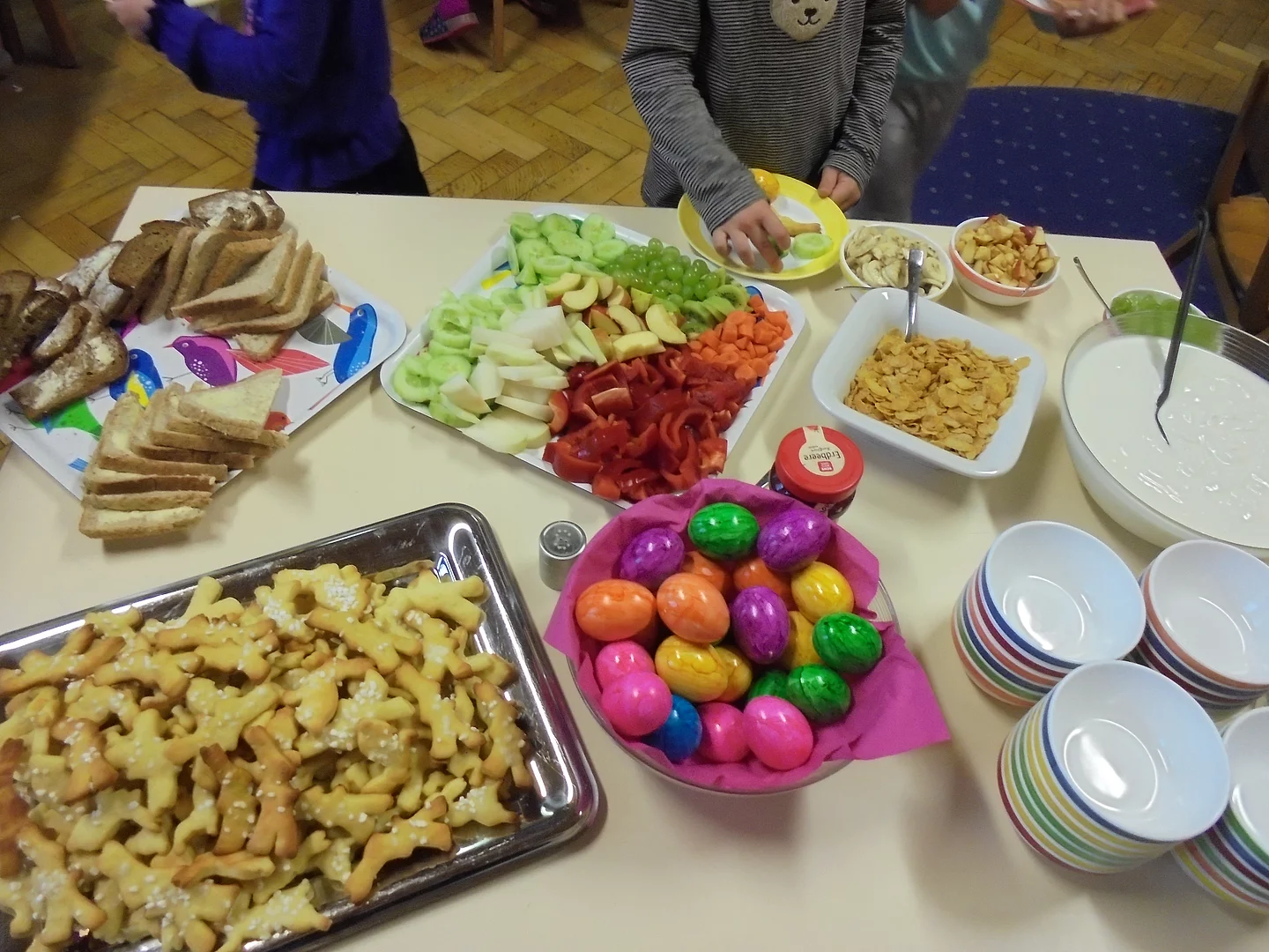 Alle 14-Tage gibt es für unsere Spatzenkinder das Hasenfrühstück. An diesem Tag kochen und backen wir mit den Kindern oder bereiten miteinander eine Brotzeit für alle zu. Im Anschluss machen wir gemeinsam Brotzeit.